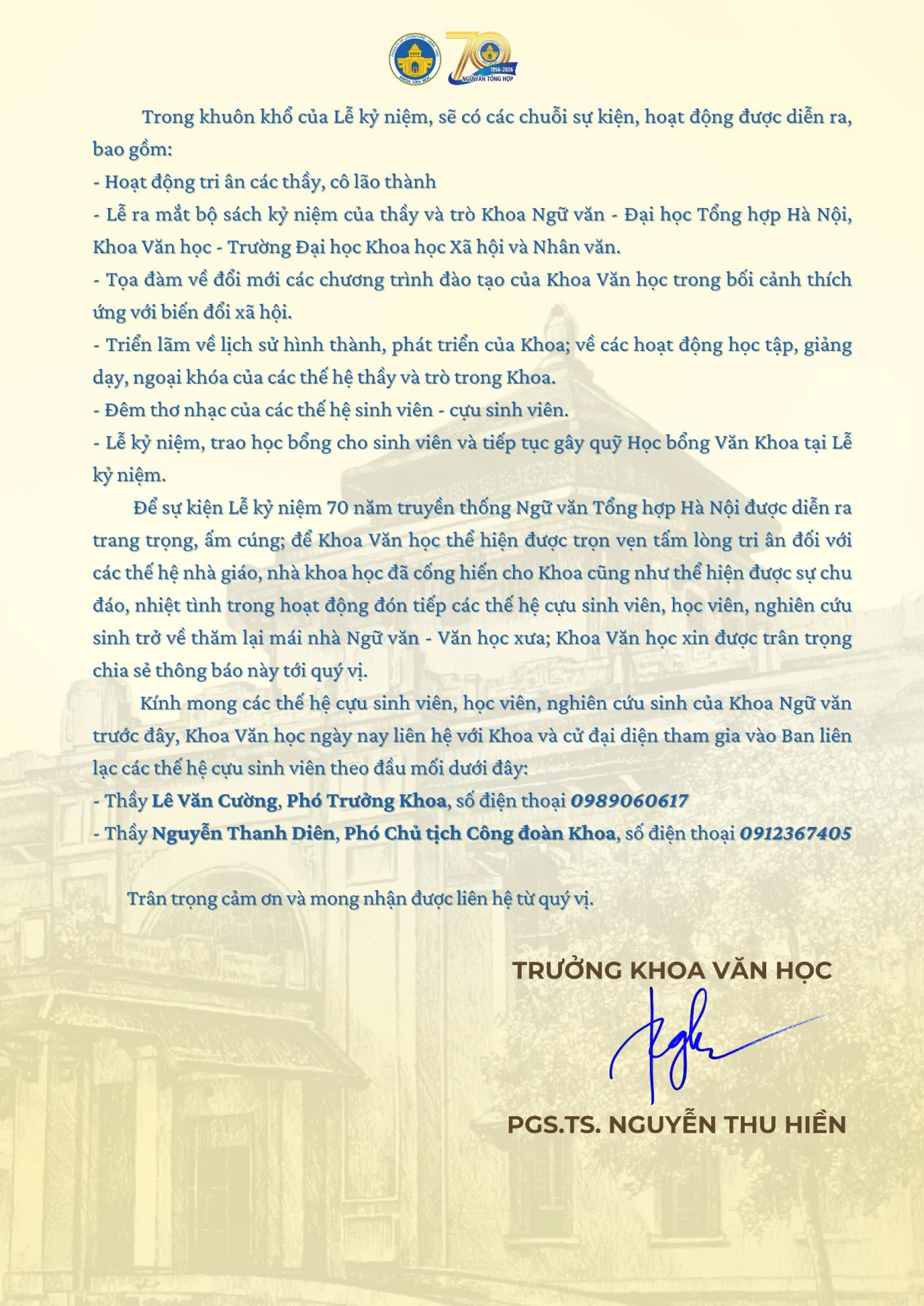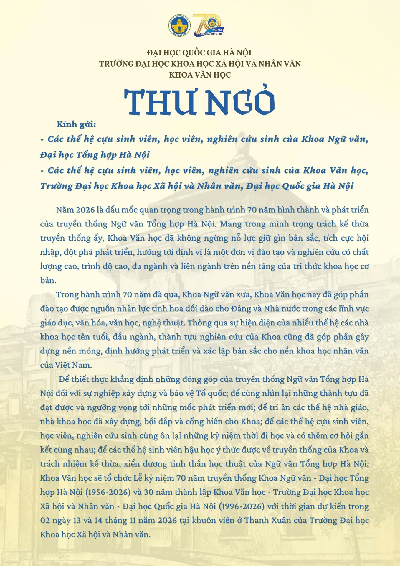 Thư ngỏ về Lễ kỷ niệm 70 năm truyền thống Khoa Ngữ văn (1956-2026) và 30 năm thành lập Khoa Văn học (1996-2026)